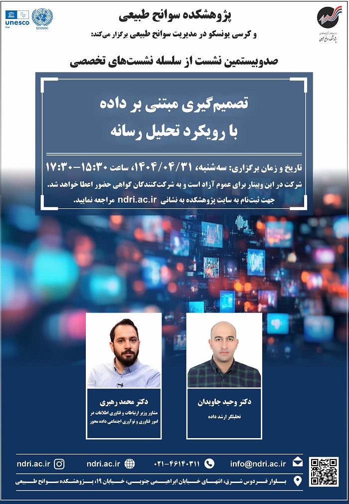 به اطلاع می رساند صد و بیستمین نشست از سلسله نشست های تخصصی با عنوان " تصمیم گیری مبتنی بر داده با رویکرد تحلیل رسانه " توسط پژوهشکده سوانح طبیعی و کرسی یونسکو در مدیریت سوانح طبیعی، به صورت بر خط برگزار می گردد.